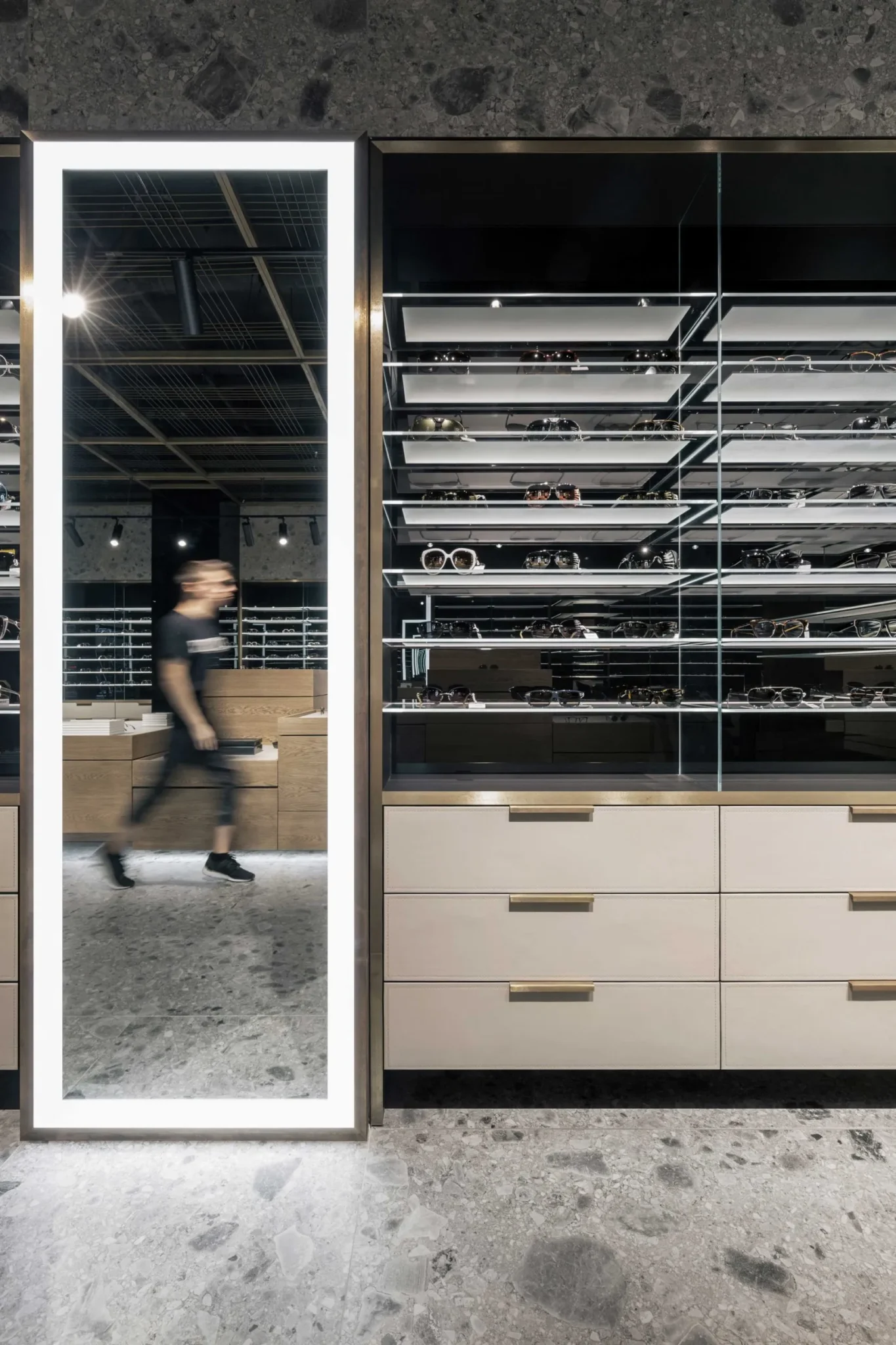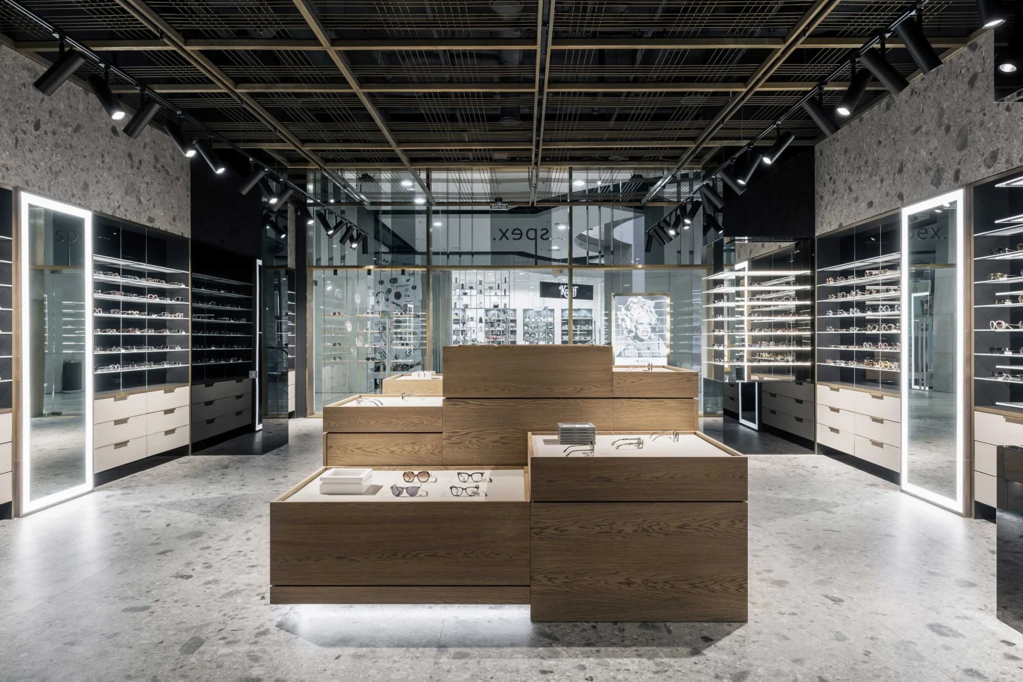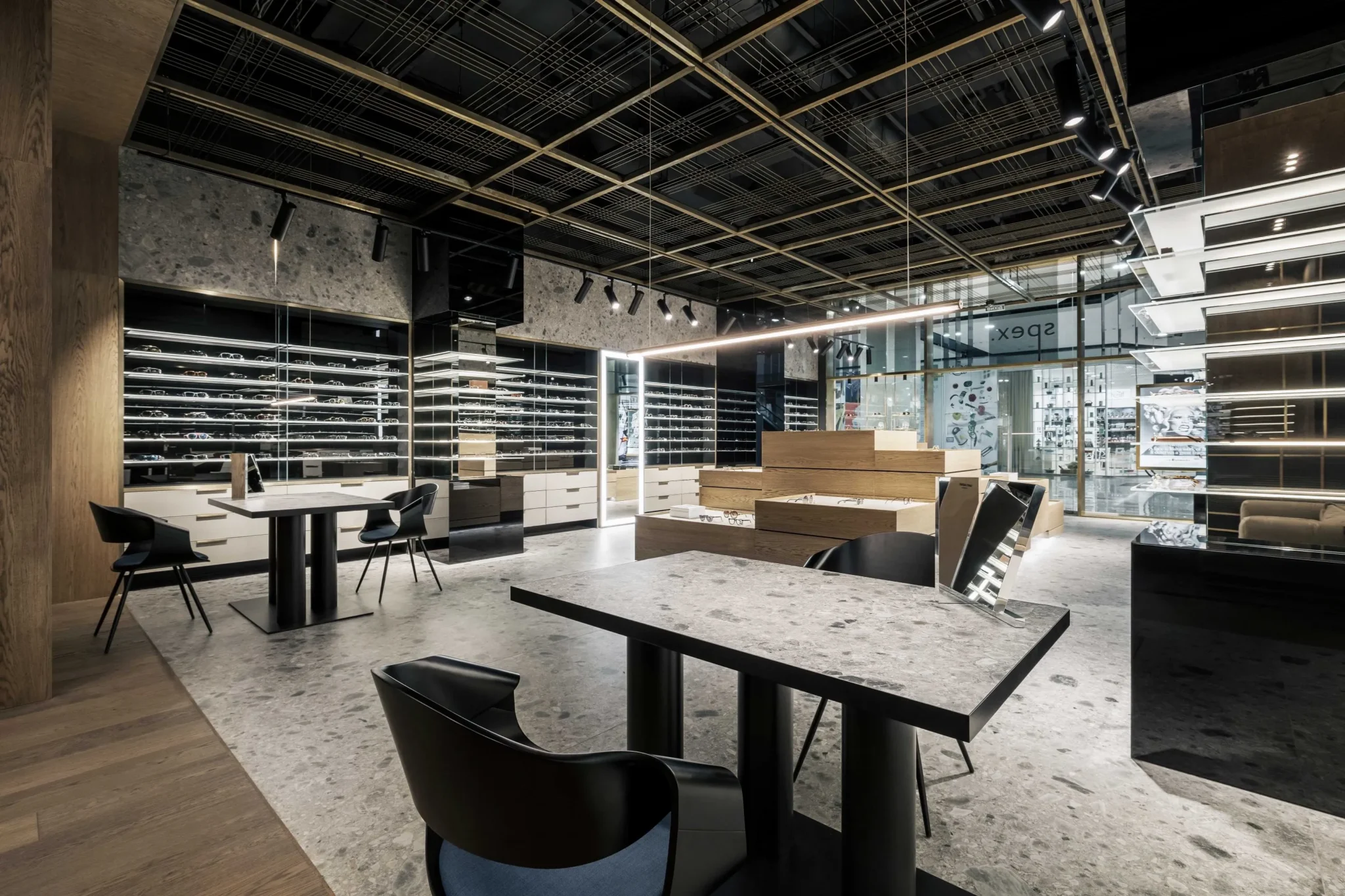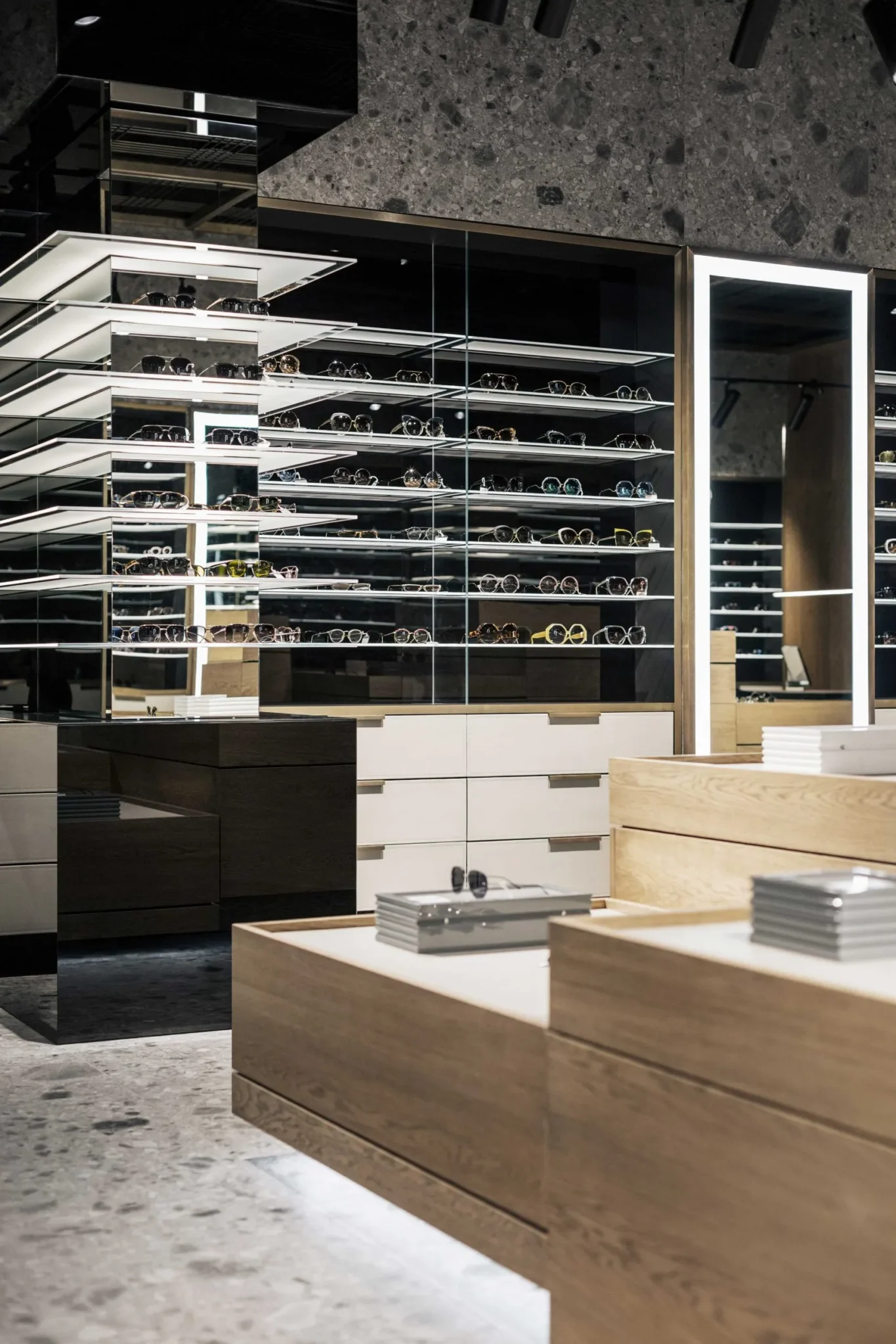 The design of the Spex eyewear showroom in Dubai was developed by the architectural studio LIVORA. Soft minimalism, ample space and natural materials are the distinguishing features of the interior. The goal of the project was to create a convenient, “clean” space that wouldn’t distract, but helps customers navigate the range of glasses. The interior is organized according to classical principles: a glass entrance area, a spacious exhibition hall, and a customer service area. The open layout ensures a smooth flow from one area to another. The modern minimalistic style of the space is emphasized by the restrained color scheme. Copper elements and mirror surfaces were used to create a charming and stylish ambience. It produces an informal setting for the retailer and customer, letting them interact in a welcoming space. Muffled, calm tones create a soft, relaxed atmosphere.