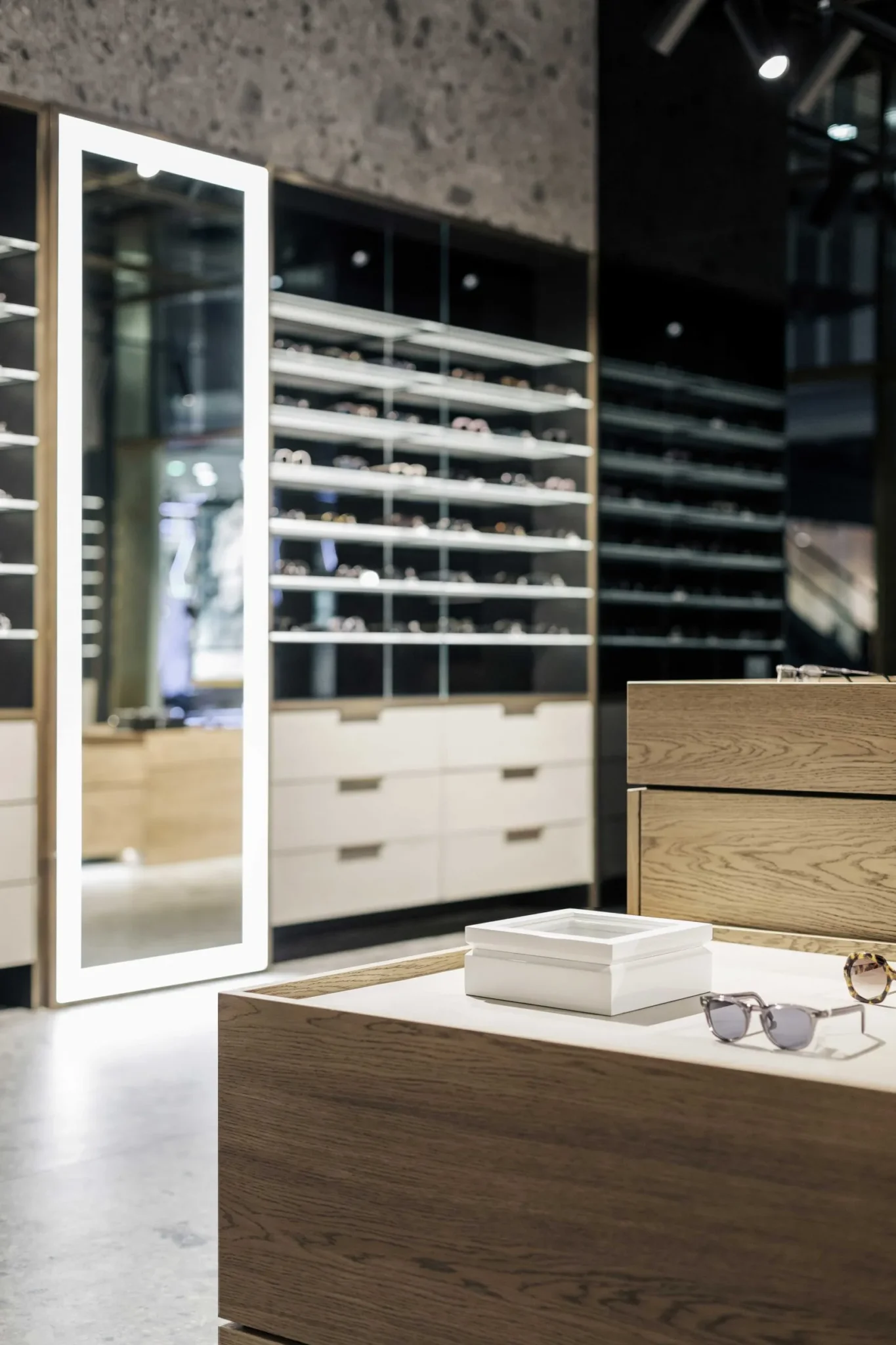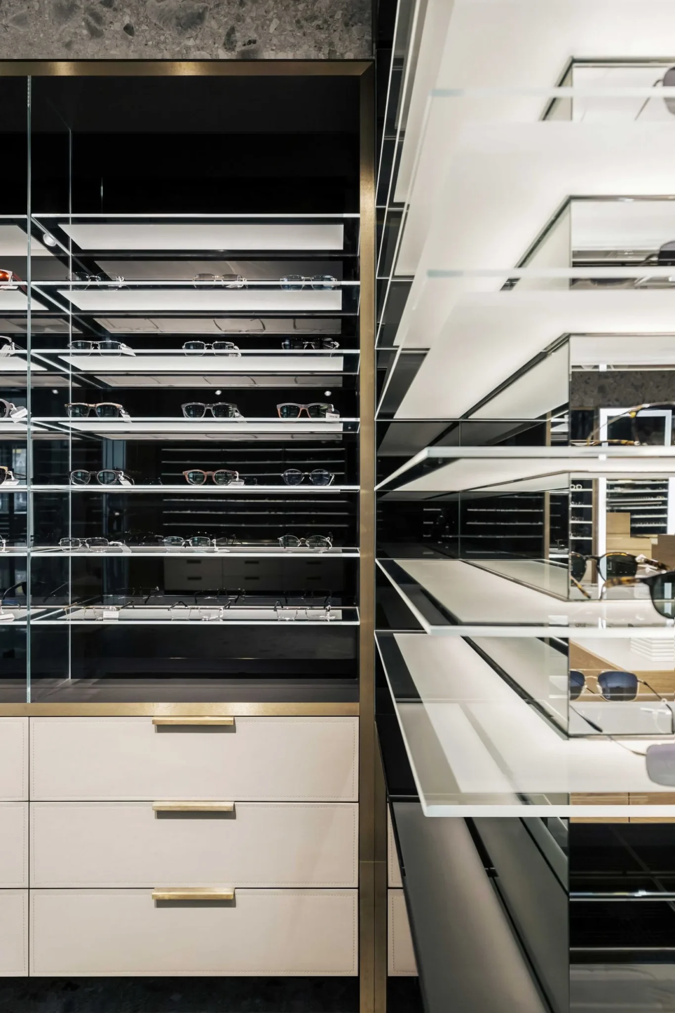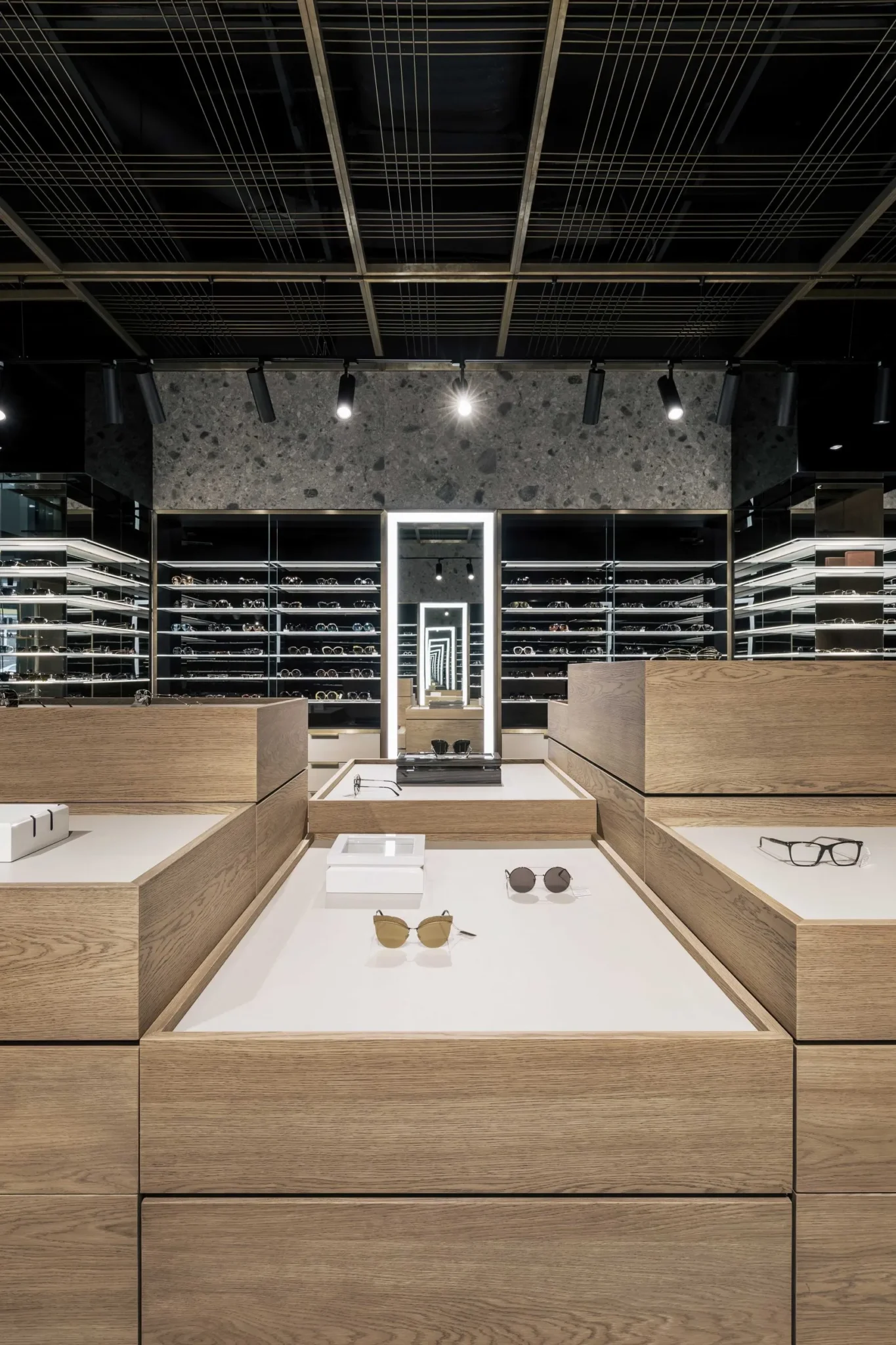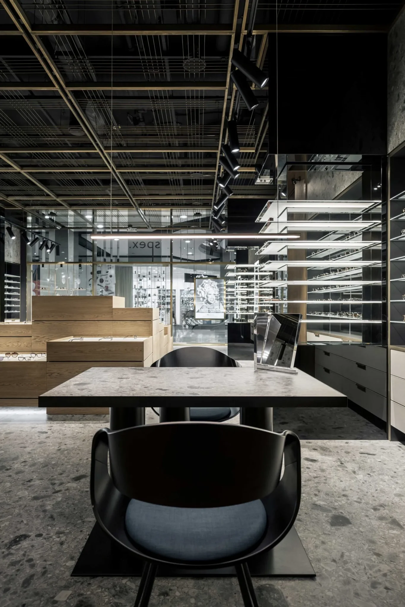 The design of the Spex eyewear showroom in Dubai was developed by the architectural studio LIVORA. Soft minimalism, ample space and natural materials are the distinguishing features of the interior. The goal of the project was to create a convenient, “clean” space that wouldn’t distract, but helps customers navigate the range of glasses. The interior is organized according to classical principles: a glass entrance area, a spacious exhibition hall, and a customer service area. The open layout ensures a smooth flow from one area to another. The modern minimalistic style of the space is emphasized by the restrained color scheme. Copper elements and mirror surfaces were used to create a charming and stylish ambience. It produces an informal setting for the retailer and customer, letting them interact in a welcoming space. Muffled, calm tones create a soft, relaxed atmosphere.